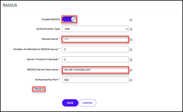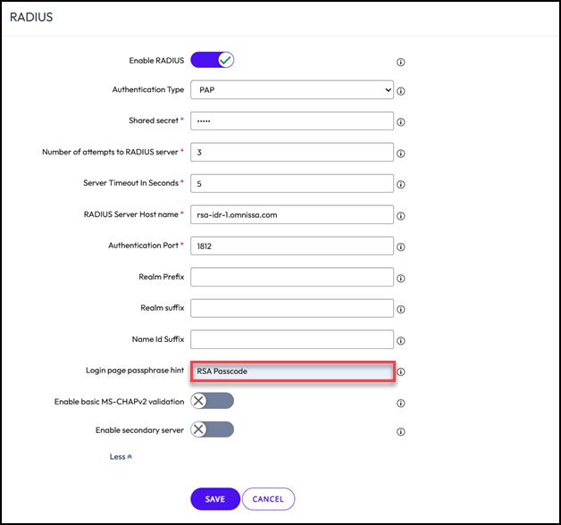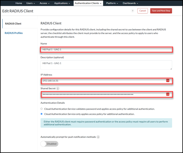 - Enter the Hostname or IP Address of the RSA Identity Router management interface and the Shared Secret (max 64 characters for UAG) previously used to create the RADIUS client in the RSA Cloud Authentication Service console as well as any other necessary fields.