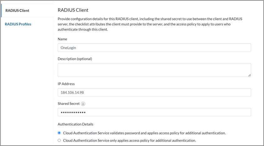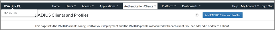- Sign in to Cloud Administration Console and click Authentication Clients > RADIUS > Add RADIUS Client and Profiles.