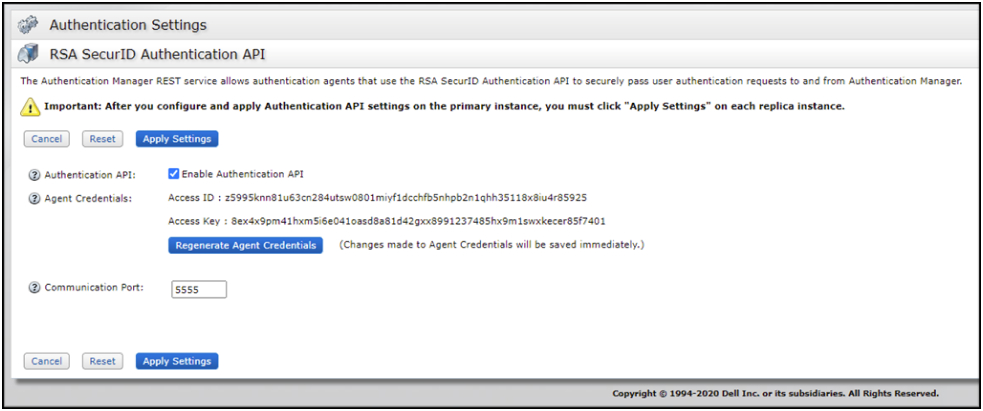 - Access ID: The unique identifier of the Authentication Manager previously retrieved from the RSA Authentication Manager configuration.