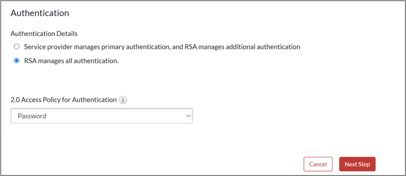 - On the Authentication page, choose RSA manages all authentication.