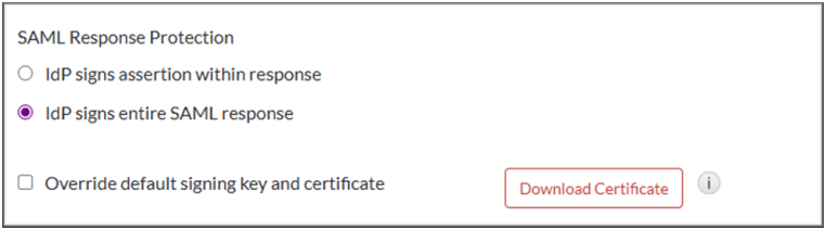 - Under the Message Protection section, choose IdP signs entire SAML response.