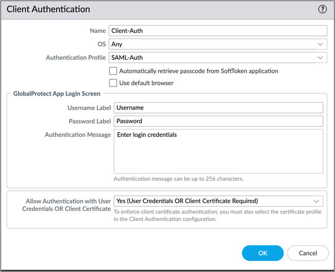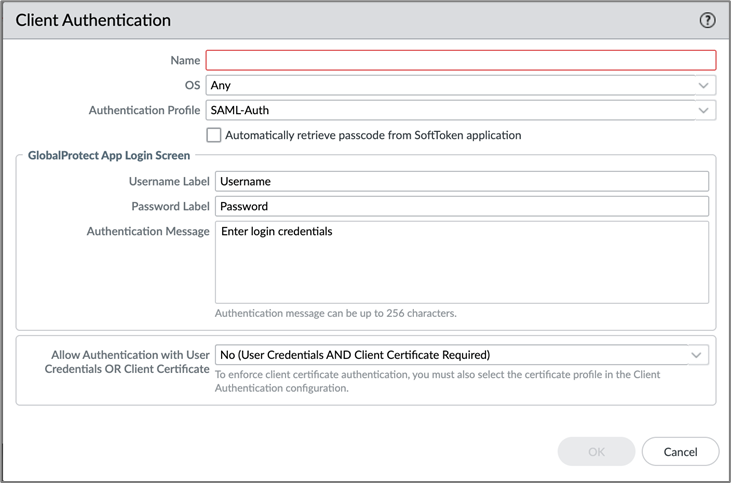 - On the Global Protect Portal Configuration page, navigate to Authentication and click Add under Client Authentication.