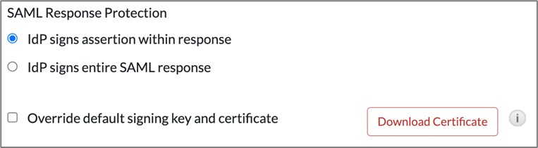 - Under the Message Protection section, choose IdP signs assertion within response.