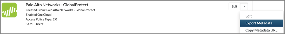 - In the Edit drop-down list, choose Export Metadata. This metadata will be used later in the Palo Alto configuration.