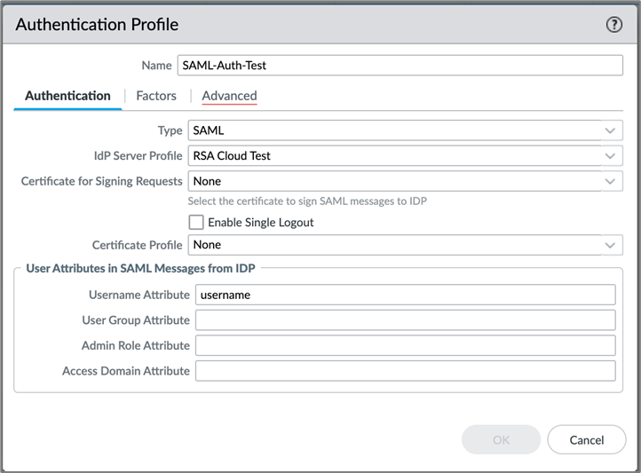 - In the left pane, click Authentication Profile. A SAML Authentication Profile will be created and tied to the SAML Identity Provider Server created earlier.
