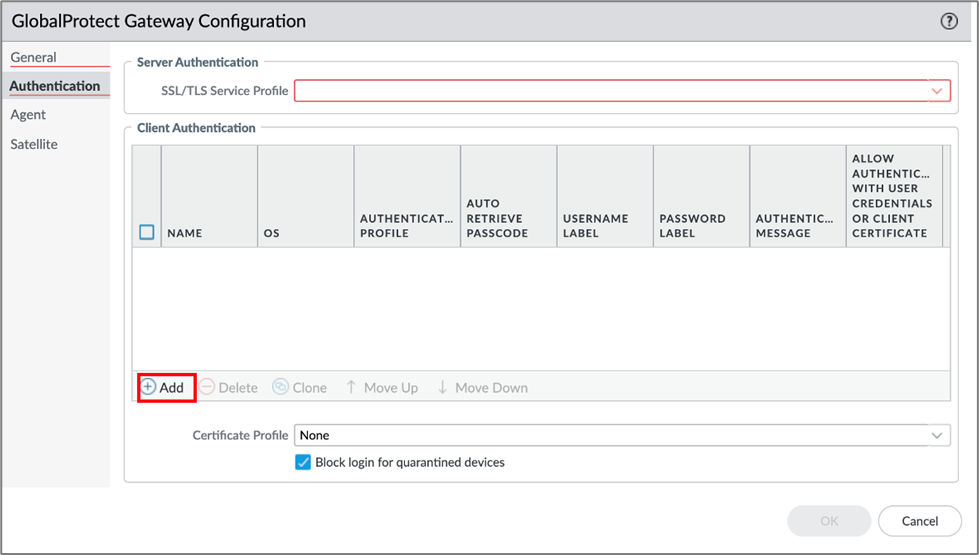 - On the Global Protect Gateway Configuration page, navigate to Authentication and click Add under Client Authentication.