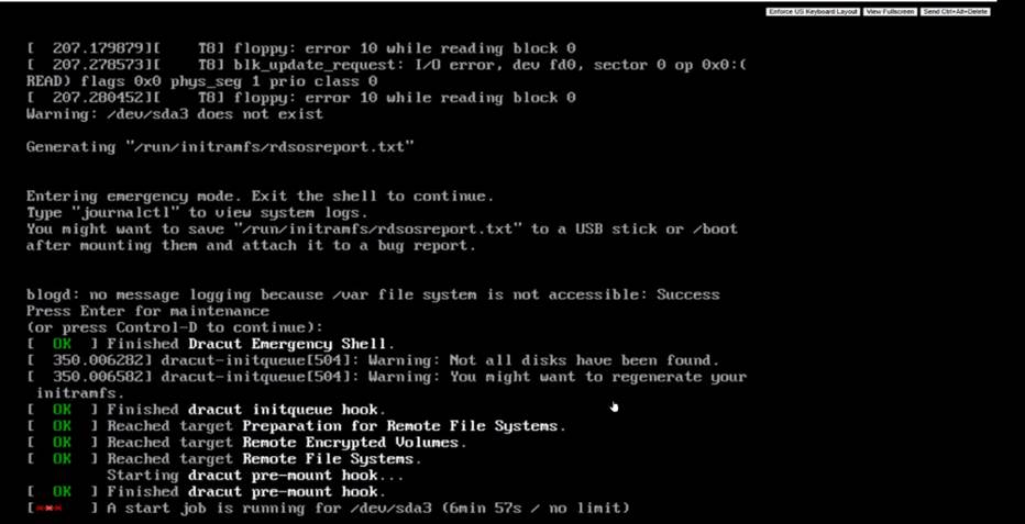 It is observed that when rebooting the Virtual Machine from vSphere, you may bypass Emergency Mode; however, you will be unable to interact with anything while the start job for /dev/sda3 is running indefinitely.