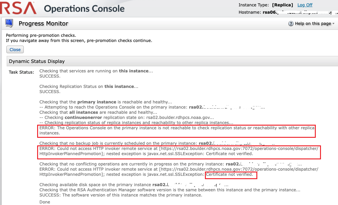 The original RSA Authentication Manager primary server rsa02 has a replacement console certificate, while the replica being promoted has RSA self-signed console certificate. Or if primary and replica have console replacement certs signed by different CAs, e.g. Entrust and Komodo. Note: GoDaddy.com and GoDaddy Group are different CAs. Because of this the replica does not trust the primary replacement console certificate, and vice versa.