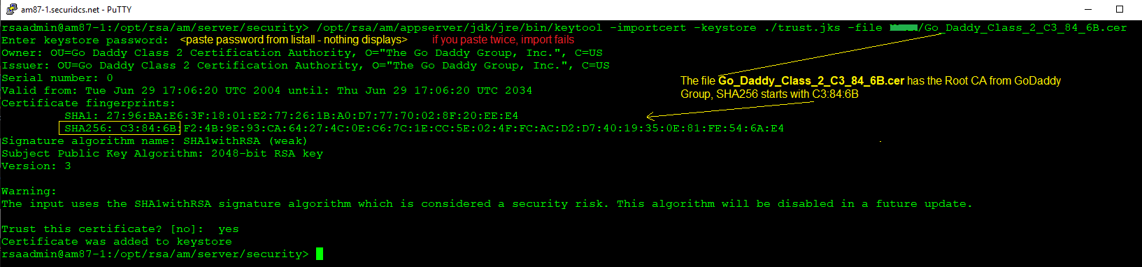 /opt/rsa/am/appserver/jdk/jre/bin/keytool -importcert -alias GoDadComRoot -keystore ./trust.jks -file /tmp/Go_Daddy_Root_Certificate_Authority_G2_45_14_0B.cer