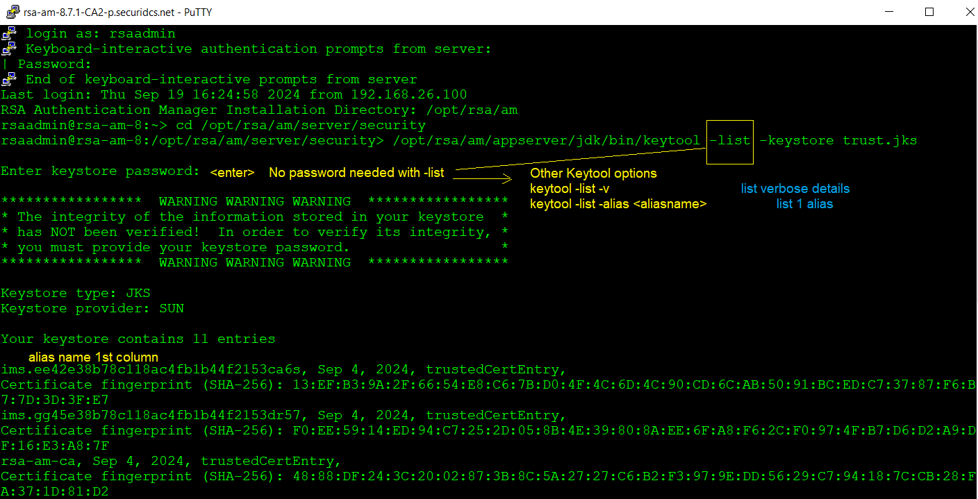 - RSA Support also strongly recommends against deleting any certificate or keys with keytool, as you could make your AM server inoperable. BE VERY CAREFUL with keytool. Open a Support Case for Assistance.