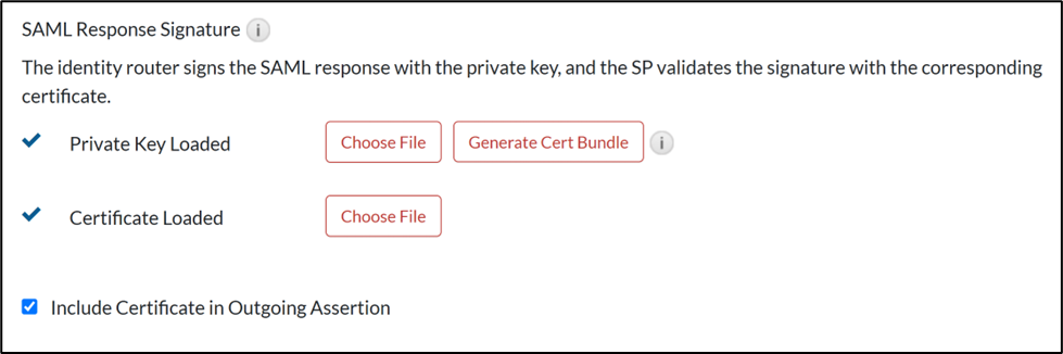 - Scroll to the SAML Response Signature section and click the Generate Certificate Bundle button.