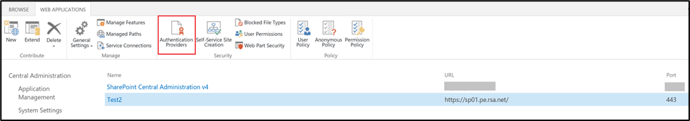 - Highlight the web application you want to configure and click the Authentication Providers button.