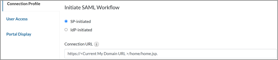 - In the Connection Profile section, select the SP-initiated option and provide the Connection URL in the following format: https://<Current My Domain URL >/home/home.jsp.