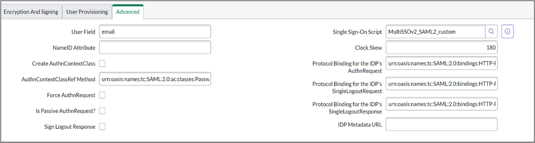 - Protocol Binding for the IDP's SingleLogoutResponse - urn:oasis:names:tc:SAML:2.0:bindings:HTTP-Redirect