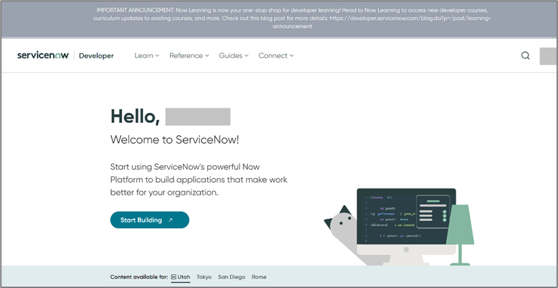 - Log in to ServiceNow admin console - https://developer.servicenow.com.