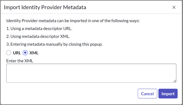 - Choose the XML option in the Import Identity Provider dialog box.