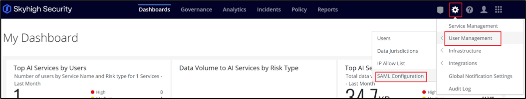 - Go to the Gear Icon at the top right, and then click User Management >SAML Configuration.