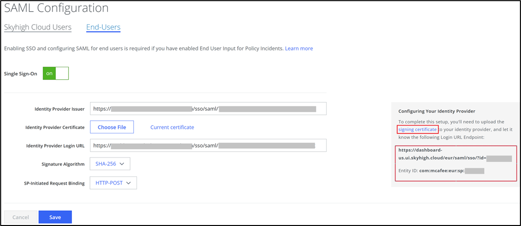 - In the Service Provider section, for Service Provider Entity ID copy paste the value from Skyhigh (Refer Skyhigh section).