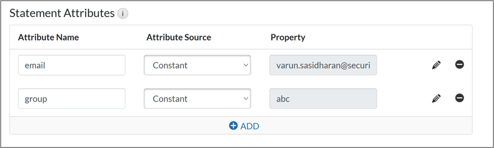 - The group and email values are constant in our configuration. This is done for testing purposes. These attributes can be retrieved from your identity source.