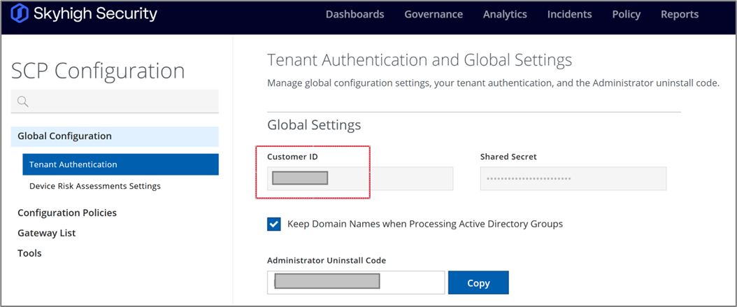 - Click the settings icon and navigate to Infrastructure > Client Proxy Management > Global Configuration > Tenant Authentication and copy the Customer ID.