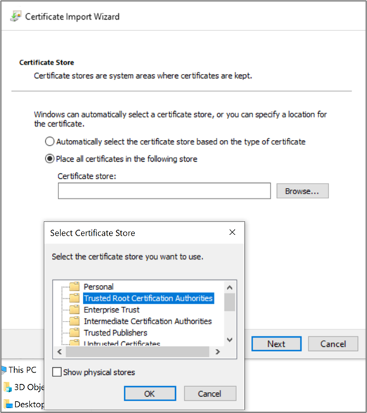- Select the store as Trusted Root Certification Authorities and click OK.