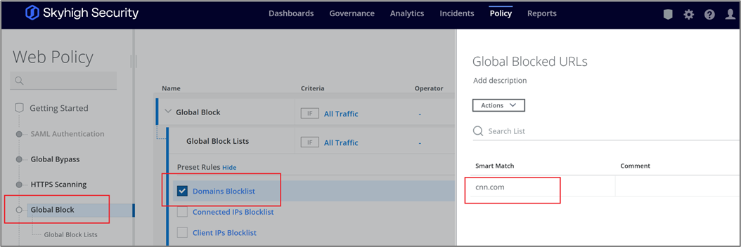 - (Optional) Navigate to Policy > Web Policy > Policy > Global Block > Global Block Lists and add the URLs that need to be blocked. These URLs will be blocked even after the user is authenticated by RSA.