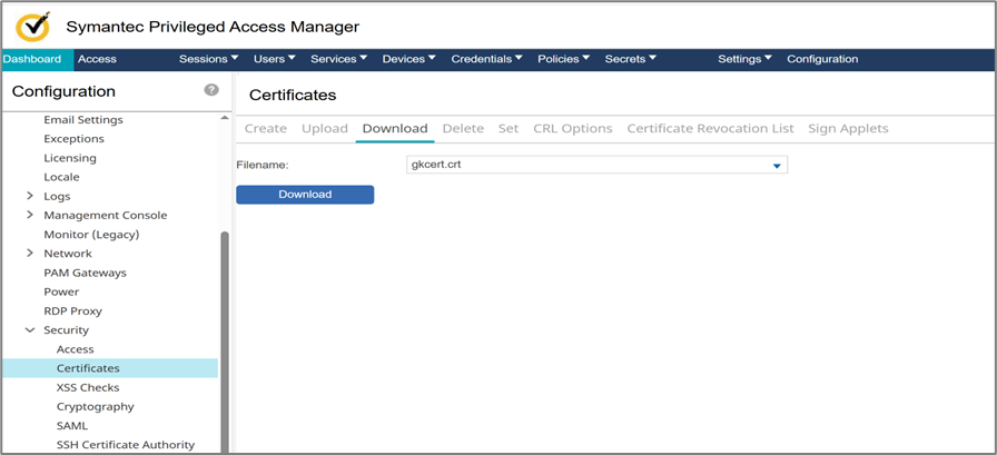 5. Navigate to Configuration > Security > Certificates > Download from Filename and select the certificate to download it. This needs to be used in CAS configuration.