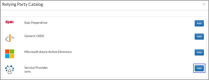3. On the Relying Party Catalog page, click Add a Relying Party and click Add for Service Provider SAML.