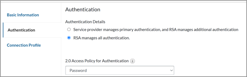 5. On the Authentication tab, choose RSA manages all authentication, and select a Primary Authentication Method and Access Policy as required.