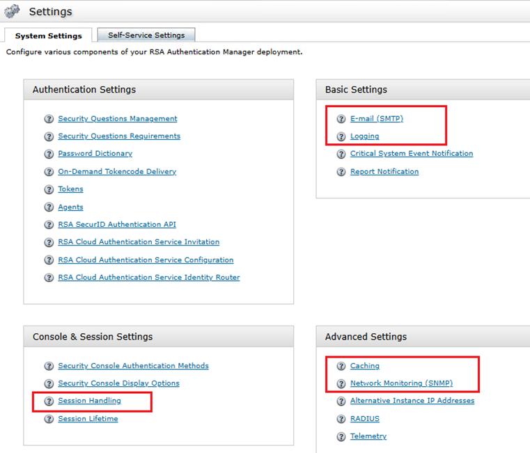 - Select one of the options below that are highlighted in red (Email (SMTP), Logging, Session Handling, Caching and/or Network Monitoring (SNMP)):