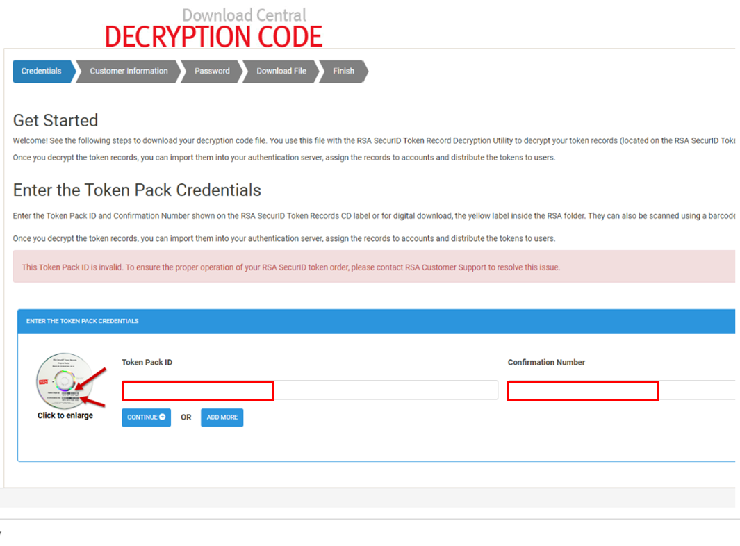 When entering the token pack ID and confirmation number on Download Central to begin the token decryption process, the following error displays: