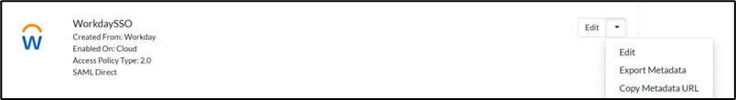 - View the newly created application on the Applications page. Choose Export Metadata from the dropdown list. This Metadata will be used later in the WORKDAY configuration.