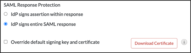 - In the Message protection section, select IdP Signs entire SAML response.