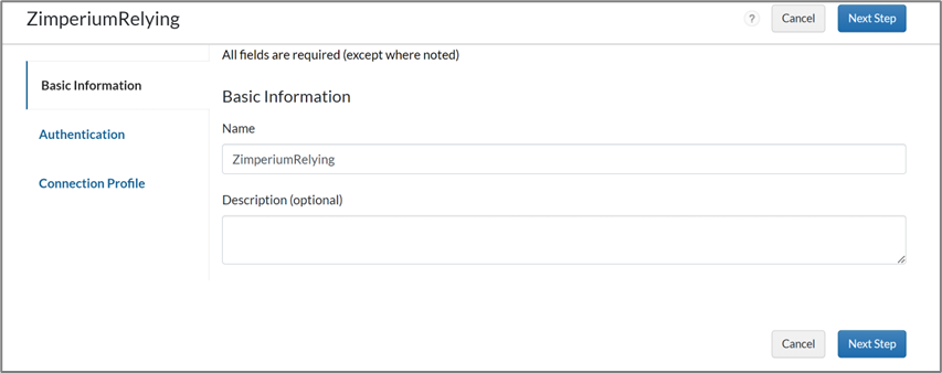 - On the Basic Information page, provide a Name for the application, for example, ZimperiumRelying.