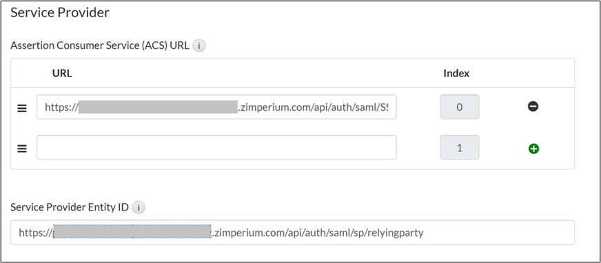 client-prefix-ZimperiumZConsole_zimperium_com_saml_metadata.xmlfile that was previously downloaded from the Zimperium zConsole. When imported, the metadata file will configure all other necessary settings on the Connection Profile page. - In the Service Provider section, provide the following details: