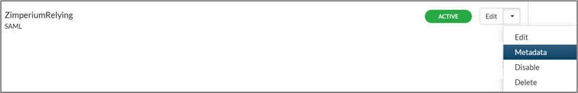 - On the Applications > My Applications page, click the Edit icon for Zimperium ZConsole and select Export Metadata from the drop-down menu. When prompted, save the exported metadata file to your computer. The default file name will be